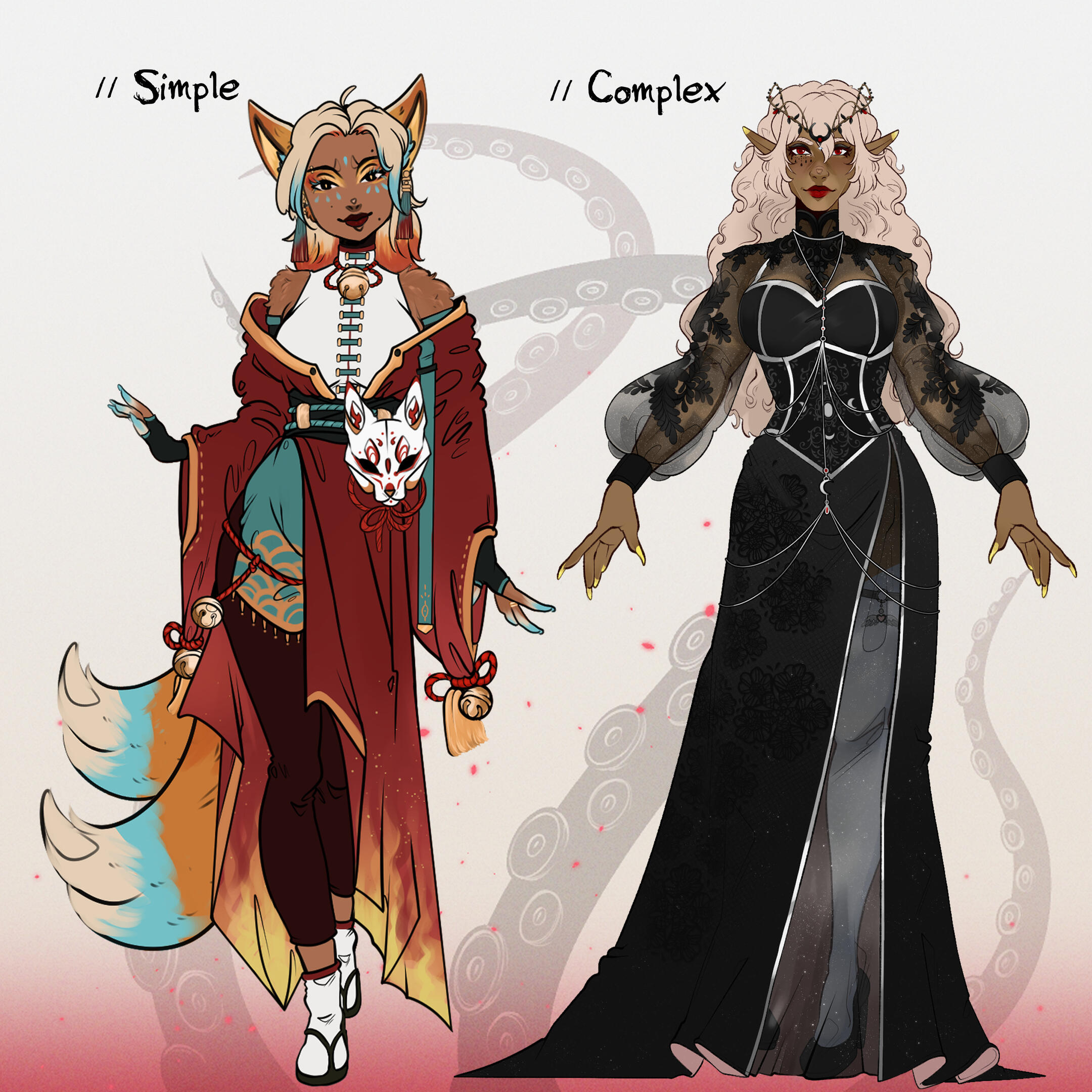 Complex characters tend to be characters that have layers, many designs/patterns and overall will take time to draw and make sure it's correct. Non-complex characters tend to be simiplier to draw, and take less time when drawing.Always make sure to provide clear references of the character or design in order for me to evaluate. It's hard to evaluate a design if it's only a headshot or limited to some degree.I'm stating this due to some questions: Characters/Designs that are POC are NOT considered complicated. I have brushes and will go out of my way to ensure I have done the design properly. Talk to me if you have any questions, I am open to discussions!If a design has several seperate patterns I'll need to design/make for you, it may be deemed complex!